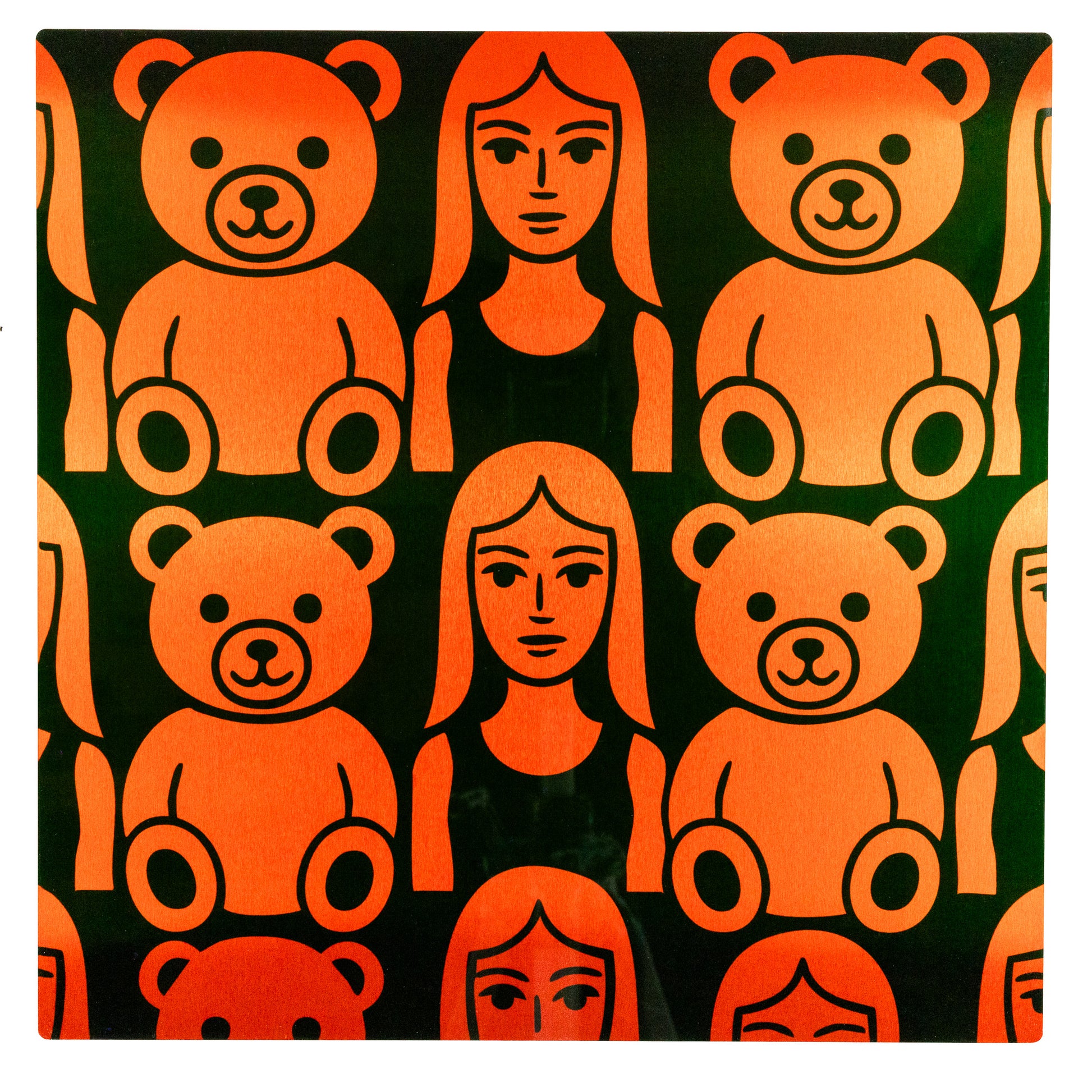 FAE F003.5 TOYS IS A SQUARE PAINTING OF DOLLS AND TEDDY BEARS ON A BLACK BACKGROUND AND FEATURES A SMOOTH SEMI REFLECTIVE SURFACE