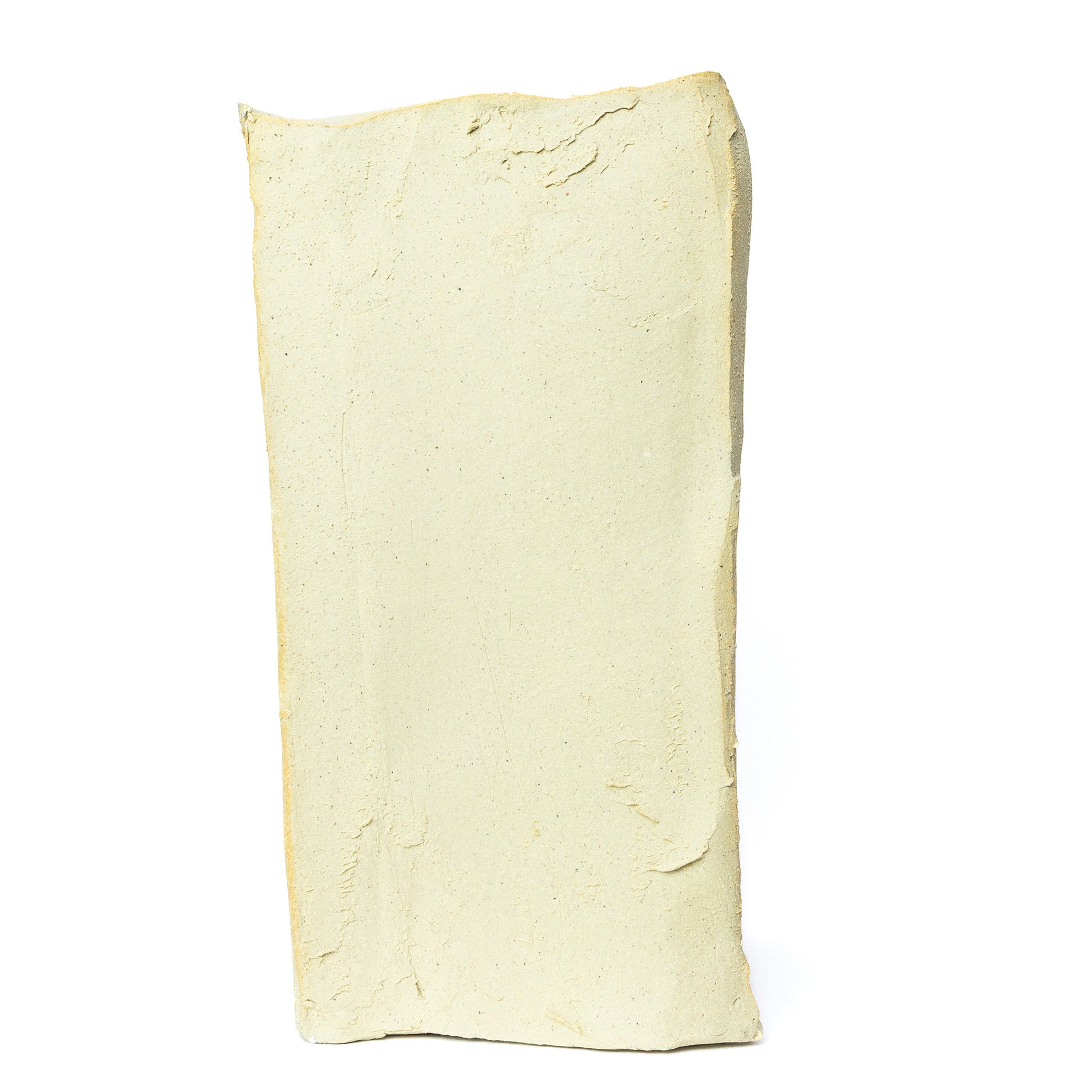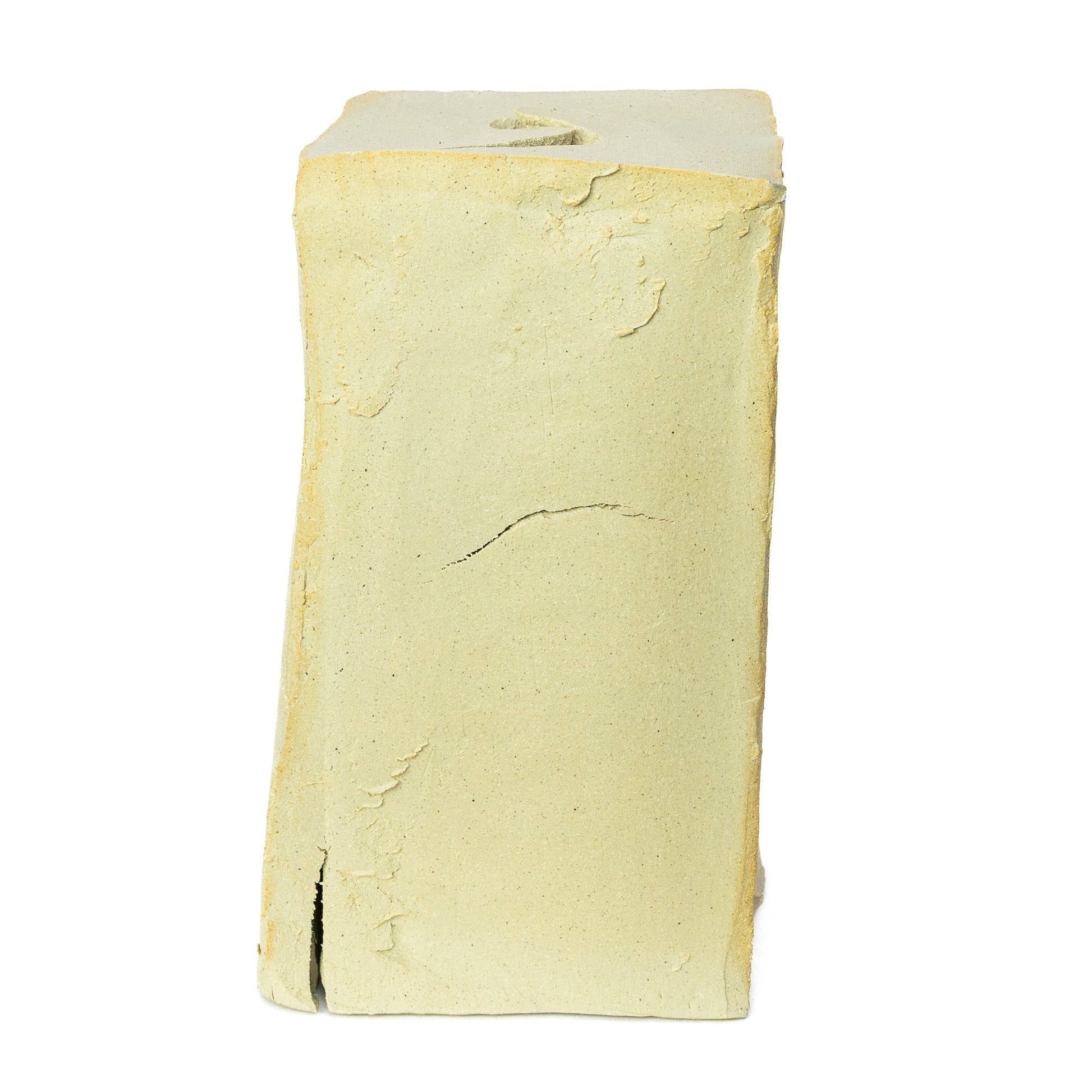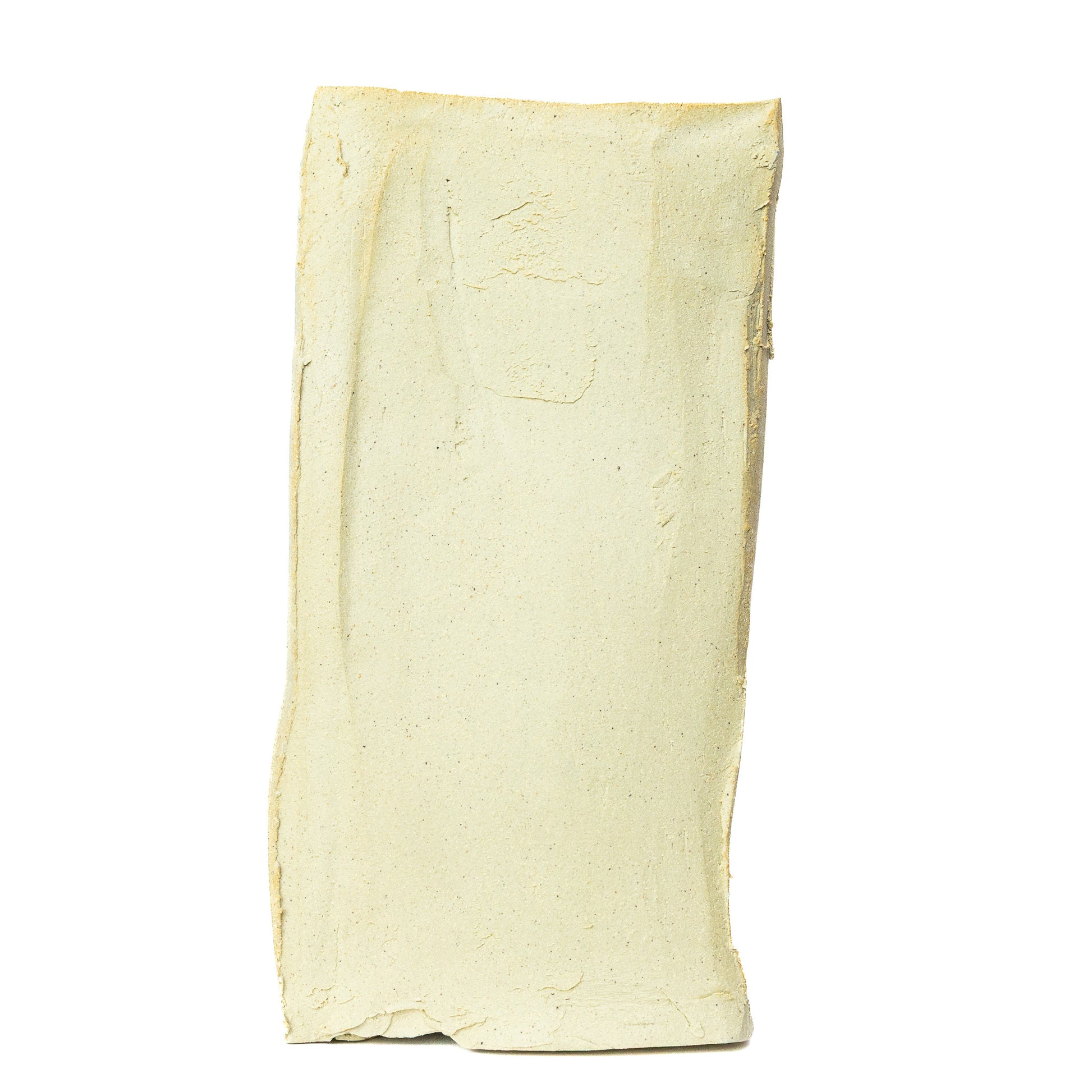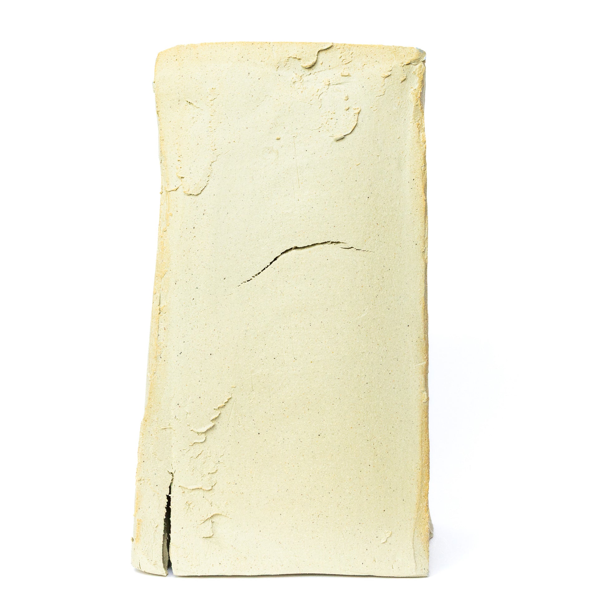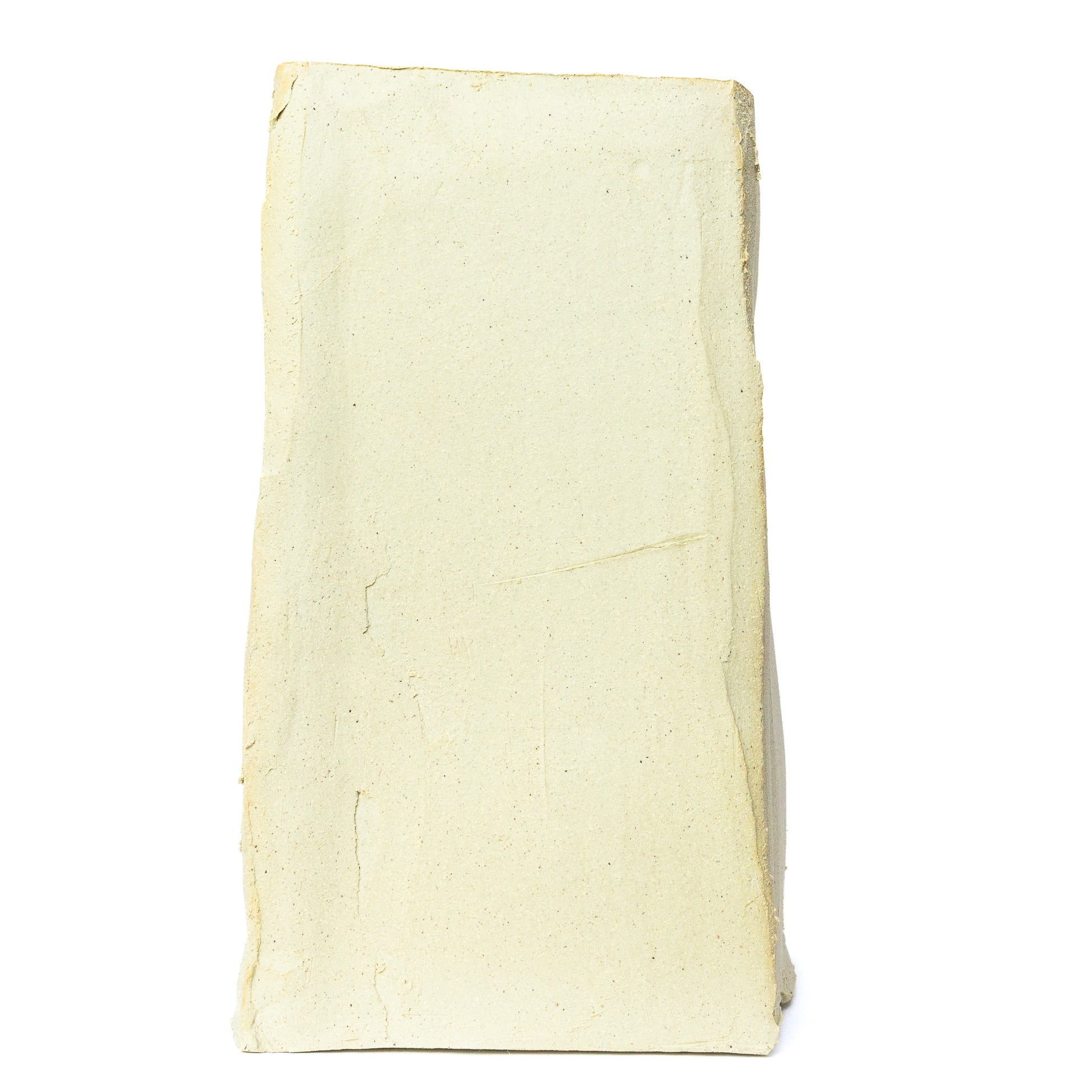FAE SPIRIT 1 IS A RECTANGULAR CERAMIC SCULPTURE AND FEATURES A ROUGH SANDY SURFACE WITH CRACKS, TEXTURE, AND TOASTED EDGES.